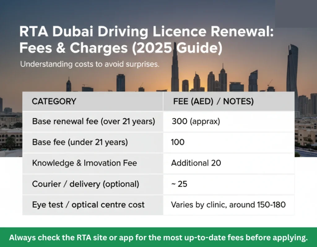 Fees: around AED 300 (for 21+), AED 100 (under 21) + AED 20 innovation fee. Documents: Emirates ID, existing licence, eye test report, passport & visa copy, plus any additional as needed.